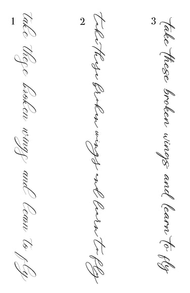 "TAKE THESE BROKEN WINGS AND LEARN TO FLY" This piece is approximately 27cm's and is best suited to the spine. Three font options available to choose from.